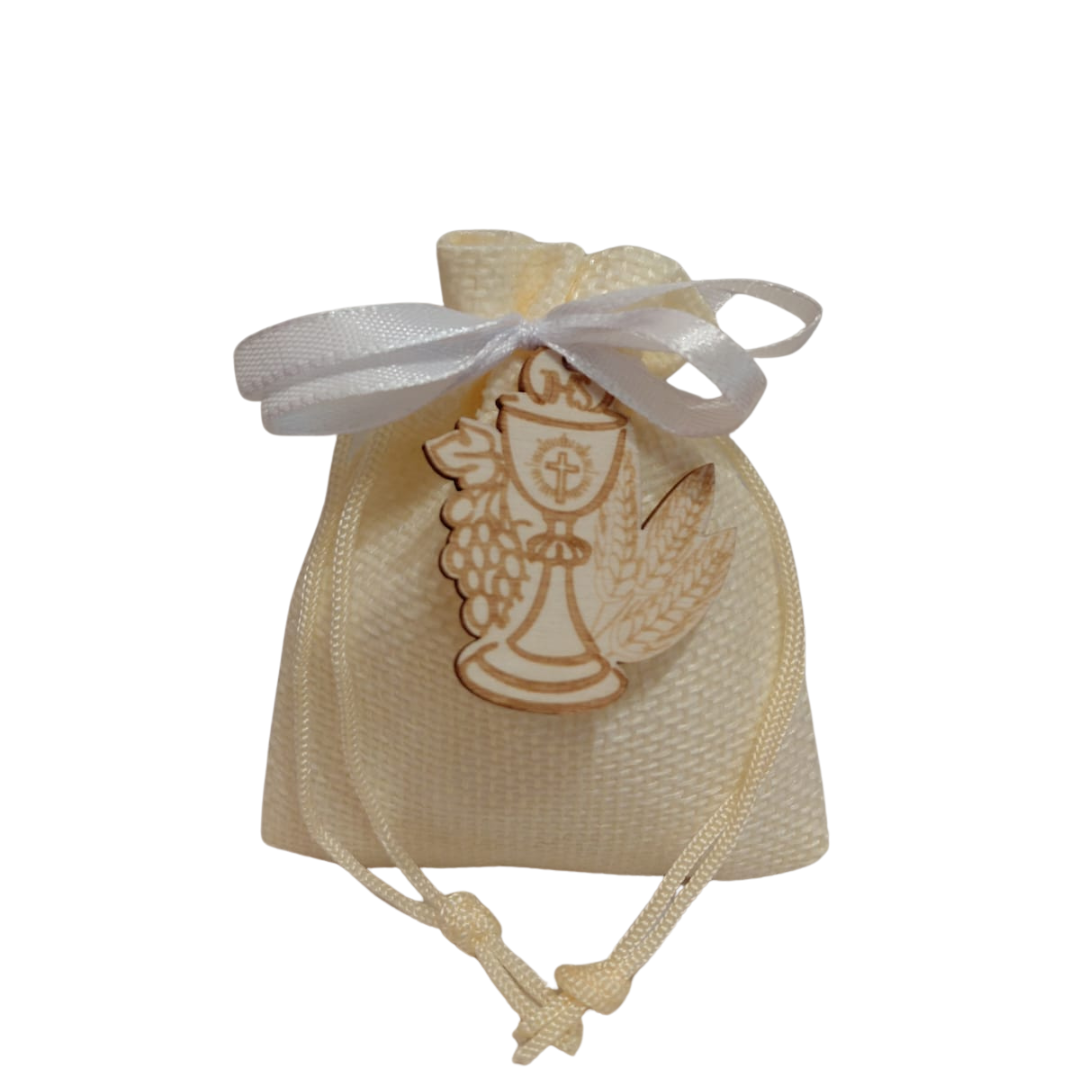 Bomboniere Solidali – Sacchetto Comunione in cotone con calice in legno (Modello 2)
